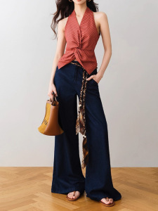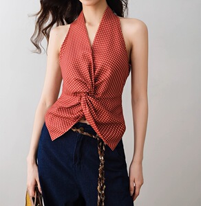 ron复古港风V领扭结褶挂脖背心2025夏新款修身显瘦格子上衣T