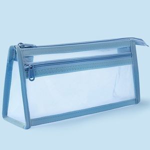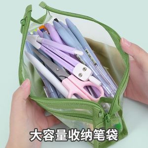 莫兰迪笔袋ins风简约透明网纱双层大容量学生考试拉链文具收纳袋