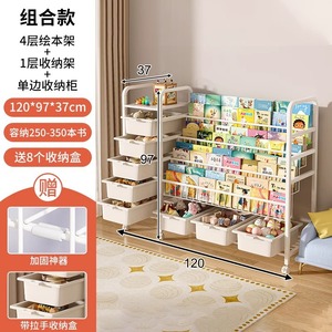 【本とおもちゃのオールインワン収納】XXLサイズ120cm - 4段本棚+1段収納ラック+片面収納キャビネット+ホワイトボックス*8 取り外し可能 - 車輪付き