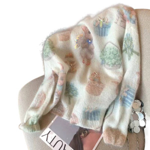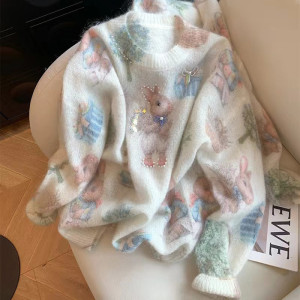 设计感小兔子钉珠印花马海毛毛衣女2025秋冬新款甜美软糯针织上衣