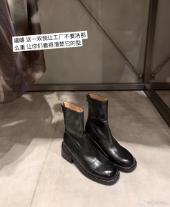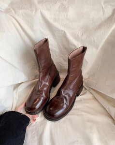 牛皮版~苏茵茵同款鞋复古真皮方头后拉链粗跟瘦瘦靴女短靴秋冬