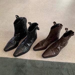 羊皮版~尖头V口西部靴女切尔西法式复古褶皱瘦瘦靴粗跟真皮短靴子