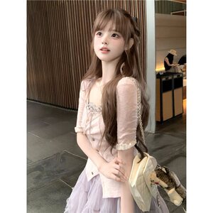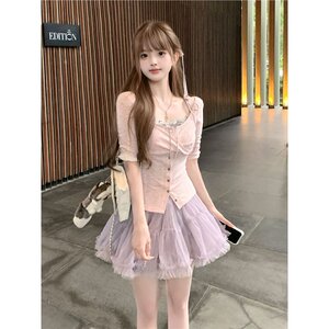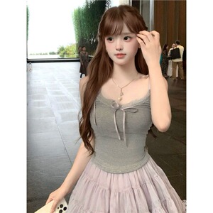 sunny ice 韩女芭蕾粉甜美上衣灰色系带吊带+a字雾紫纱裙三件套