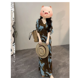 2025夏季新款晕染修身抽象V领显瘦网纱弹力透气气质连衣裙3280#