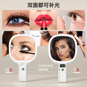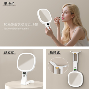 跨境便携手持化妆镜 双面带灯充电款旅行挂墙台式折叠led化妆镜子
