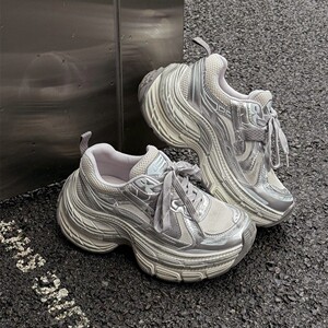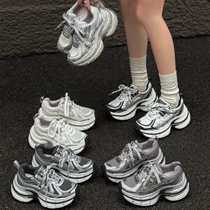 厚底真皮老爹鞋女2025秋季新款休闲运动鞋小个子增高拼色网面透气