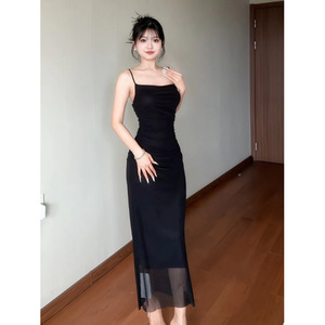 法式咖色吊带连衣裙女夏季网纱拼接收腰修身裙子纯欲紧身包臀长裙
