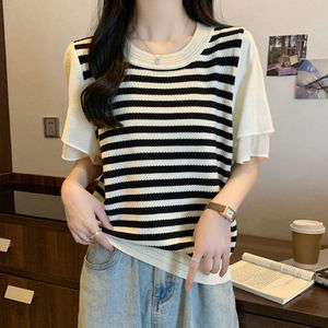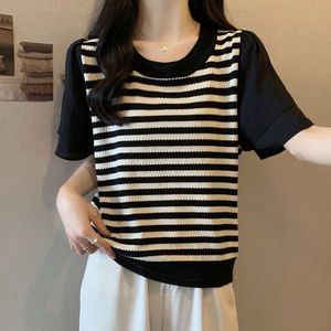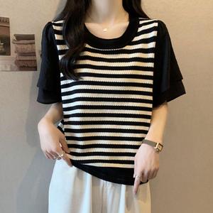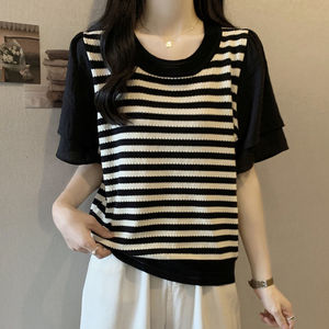 プラスサイズの女性のストライプ半袖夏 2025 新しいファット mm お腹カバー痩身シフォン Tシャツスプライシング半袖トップ