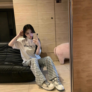 高版本迪家设计感字母阔腿牛仔裤女高腰宽松显瘦休闲拖地直筒长裤