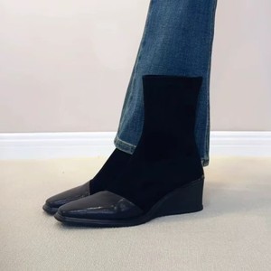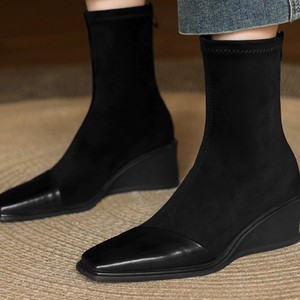 弹力瘦瘦靴2025秋季新款女靴方头拼接方头时装靴粗跟高跟鞋短靴女