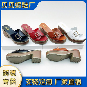 跨境时尚鞋欧美坡跟拖鞋女2025夏季新款一字带休闲厚底凉拖鞋