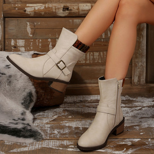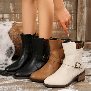 外贸秋冬女鞋皮带扣粗跟中筒靴跨境新款英伦风通勤简约休闲时装靴