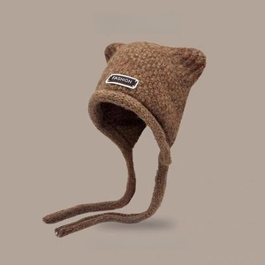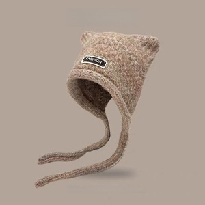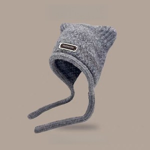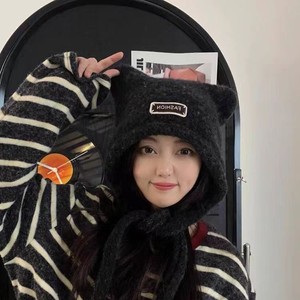 雷锋帽秋冬可爱耳朵系绳套头帽女加厚护耳针织帽保暖包头帽毛线帽