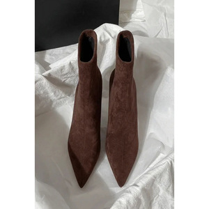 棕色短靴女高跟2025年秋冬新款百搭法式粗跟弹力靴绒面尖头瘦瘦靴