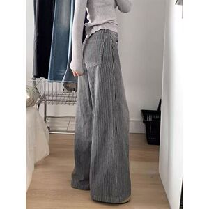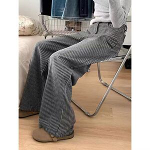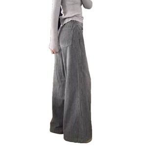 美式复古黑灰色条纹阔腿牛仔裤女春秋新款高腰宽松直筒显瘦拖地裤