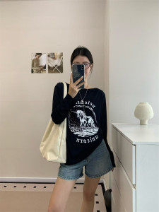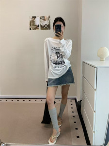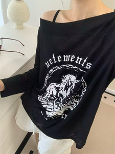 2025一字领拉肩长袖T恤女防晒衣白色字母大版宽松休闲减龄微透T夏