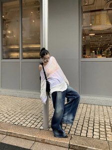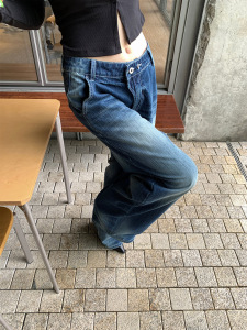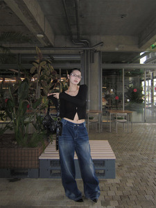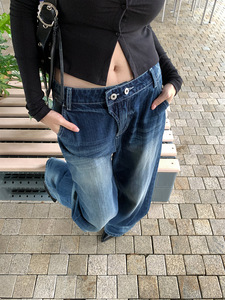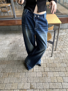 [9hour]美式错位纽扣牛仔裤女 2025秋季压树脂抓纹直筒长裤hc1311