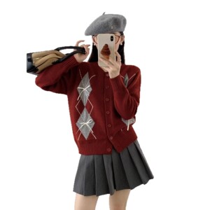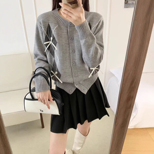 菱形格纹蝴蝶结针织开衫女秋季新款韩系设计感毛衣小个子上衣女