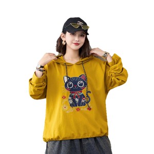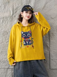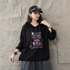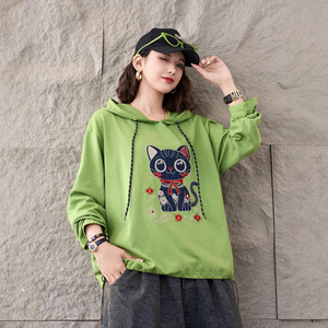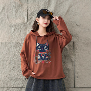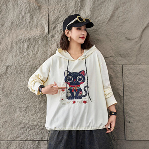 下摆抽绳连帽卫衣女2025秋新款复古宽松休闲卡通贴布刺绣套头帽衫