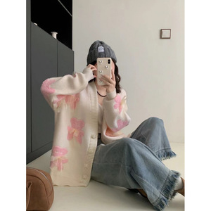 高级感超好看蝴蝶结圆领毛衣女秋冬外套宽松慵懒风爆款洋气上衣潮
