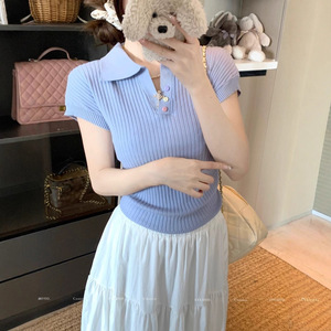 polo领短袖T恤女2025夏季新款设计感褶皱短款洋气百搭针织衫上衣