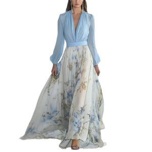 2025欧美女装 亚马逊 独立站 数码印花长袖V领 拼接长裙 连衣裙