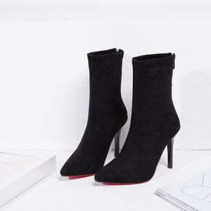 秋冬季马丁靴女韩版黑色尖头后拉链短靴细跟高跟绒面靴女保暖增高