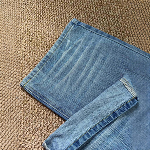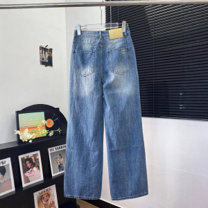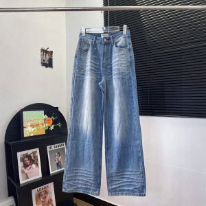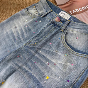 高版本25新款小香风烫钻装饰猫须水洗浅色直筒高腰拖地牛仔长裤女