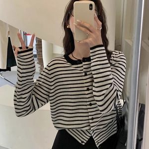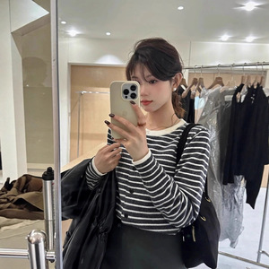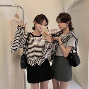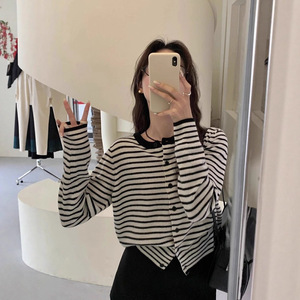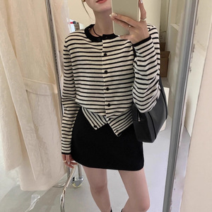 韩系高级感黑白条纹针织开衫女春秋针织衫内搭打底正肩收腰短上衣