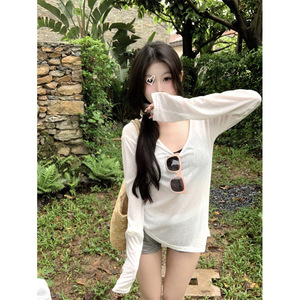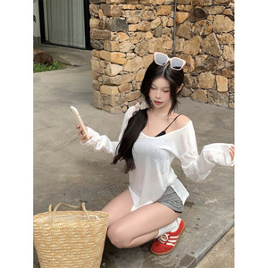 2025年夏新作 レディース ホットガール向け日焼け止めブラウス 斜め肩デザイン イレギュラー ホワイト シースルー 薄手 重ね着トップス