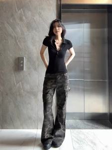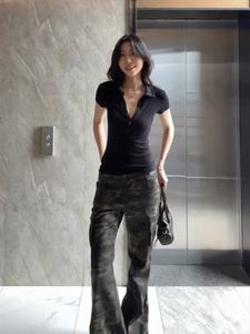 简约polo衫正肩黑色短袖t恤女夏季新款弹力收腰显瘦气质百搭上衣