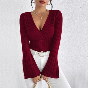 TEMU新款亚马逊跨境女欧美V领喇叭袖酒红色T恤秋冬修身打底衫上衣