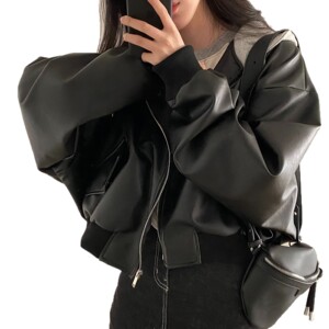 韩国chic秋冬小众复古拉链双口袋休闲宽松百搭假两件连帽皮衣外套