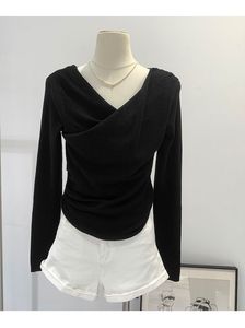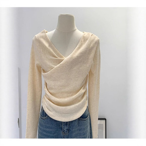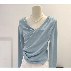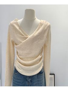 法式别致荡领扭褶斜领显瘦长袖针织衫女初秋温柔风韩系设计感上衣