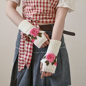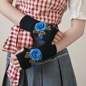 短款时尚花朵手套新款秋冬女士针织毛线袖套保暖半指露指手套