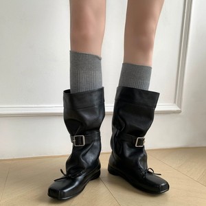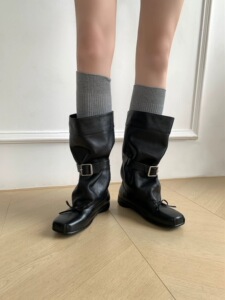 牛皮版~内增高西部牛仔靴女2025新款小个子褶皱堆堆靴粗跟骑士靴
