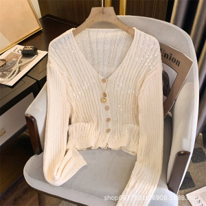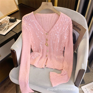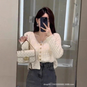 秋冬季重工亮片长袖单排扣针织开衫小香风女装上衣宽松珠片毛衣女