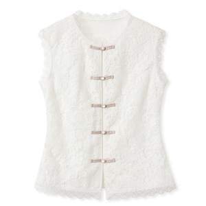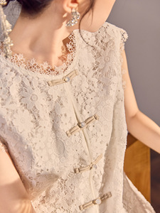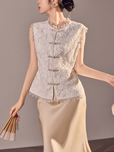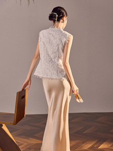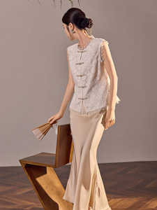 夏季轻奢气质花边刺绣修身无袖上衣纯色半裙新中式套装女 N5015