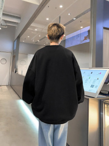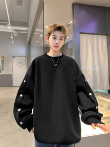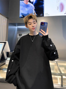 黑色排扣圆领上衣男秋款重磅高街美式情侣卫衣宽松小个子外套潮牌