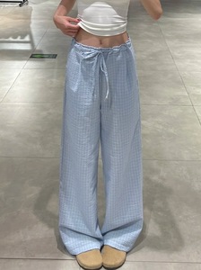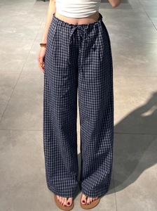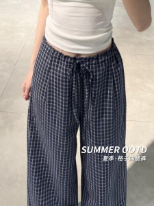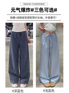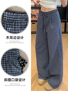 蓝色格子裤女秋季2025新款宽松显瘦垂感小众小个子直筒休闲阔腿裤