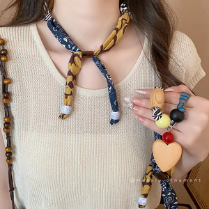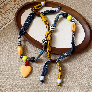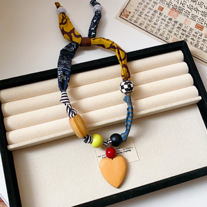 布艺印花亚克力木珠爱心吊坠项链复古民族风毛衣链气质项饰饰品女