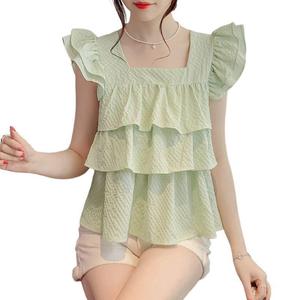 薄荷绿荷叶边小飞袖雪纺上衣女装夏款洋气减龄肌理感蓬蓬短袖衬衫