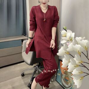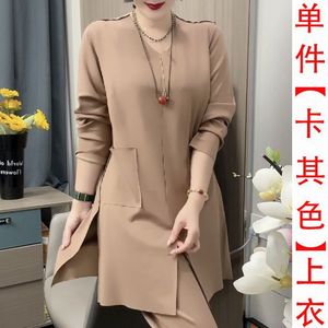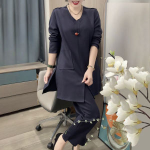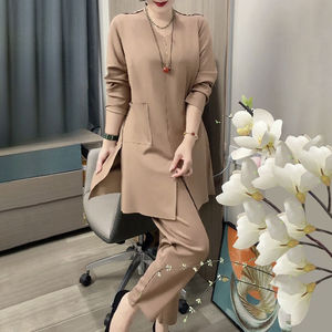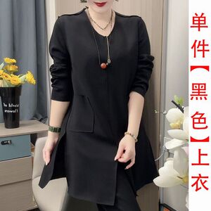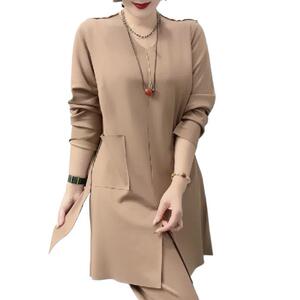 大码纯色时尚套装2025秋季新款洋气V领双兜开叉中长款休闲两件套