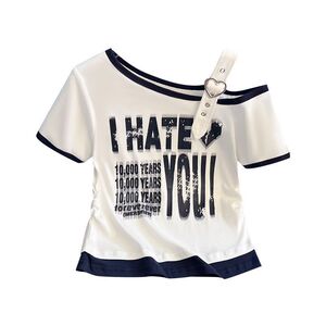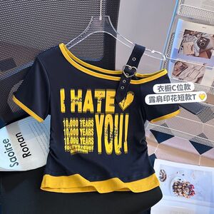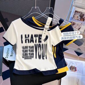大码韩版撞色露肩短袖t恤女夏季2025新款宽松显瘦遮肉百搭上衣女