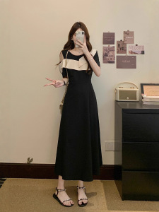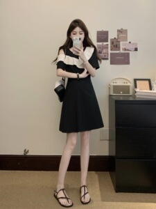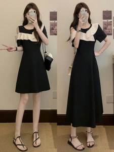 2025年大码女装胖mm新款荷叶边侧露肩气质撞色收腰法式连衣裙
