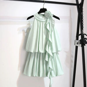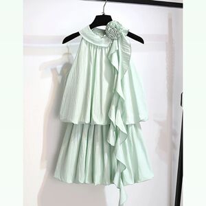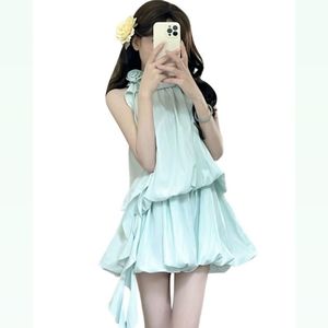 绝美薄荷绿飘带气质无袖蓬蓬花苞短裙2025夏季新款挂脖连衣裙