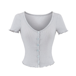 美式复古排扣式针织提花短袖T恤女2025夏新款修身木耳边上衣开衫