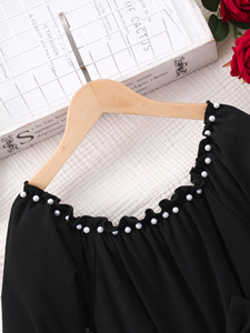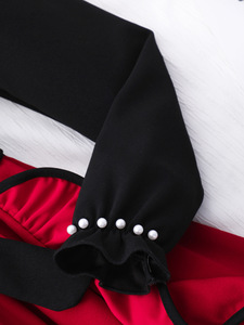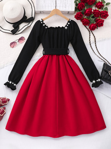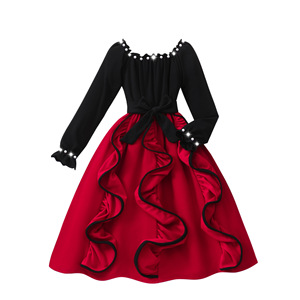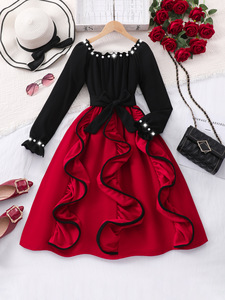 中大童(女)连衣裙,珍珠点缀拼接立体波浪长袖连衣裙