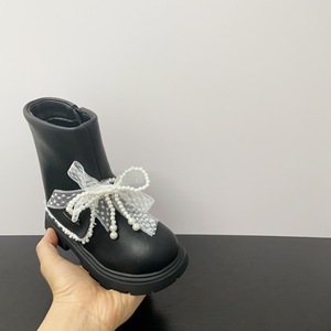 女童潮流百搭珍珠花边可拆卸蕾丝蝴蝶结中筒纯色小皮靴2025年秋款
