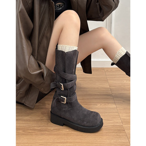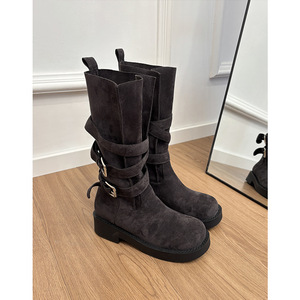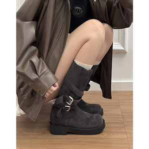 羊皮款~真皮圆头皮带扣中高筒靴子女粗跟骑士靴西部牛仔靴长筒靴